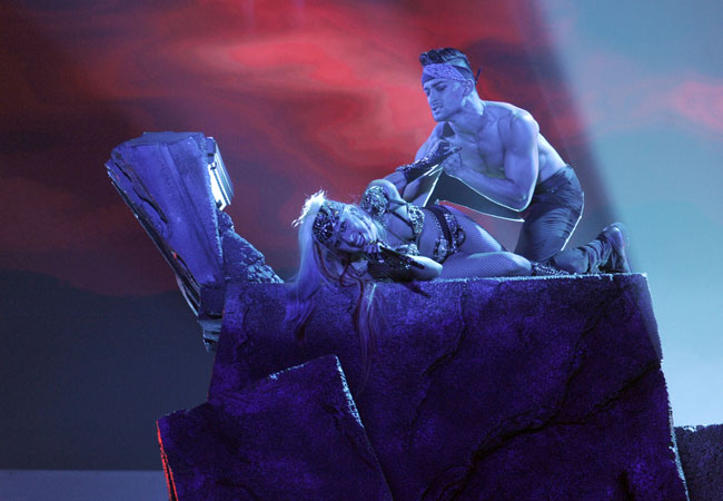 "Lady Gaga realizou uma performance ousada durante a grande final da décima temporada do “American Idol”. Na noite de quarta-feira (25), o fenômeno pop interpretou seu mais novo hit, "The Edge of Glory", enquanto realizava movimentos sensuais com um de seus bailarinos. Como de costume, a cantora exibiu mais um de seus looks extravagantes, durante a final do programa, que aconteceu no teatro Nokia, em Los Angeles, Estados Unidos.